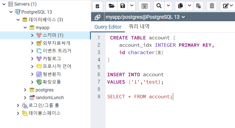 여기에서 내가 쓴 myapp은 나의 데이터베이스 이름이다.